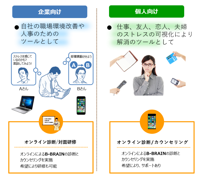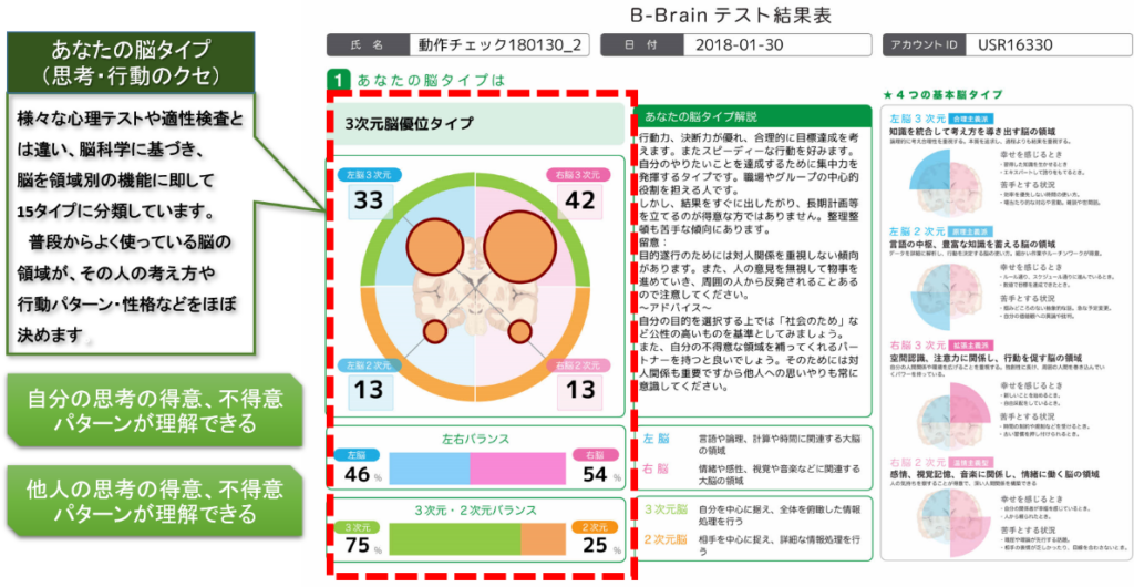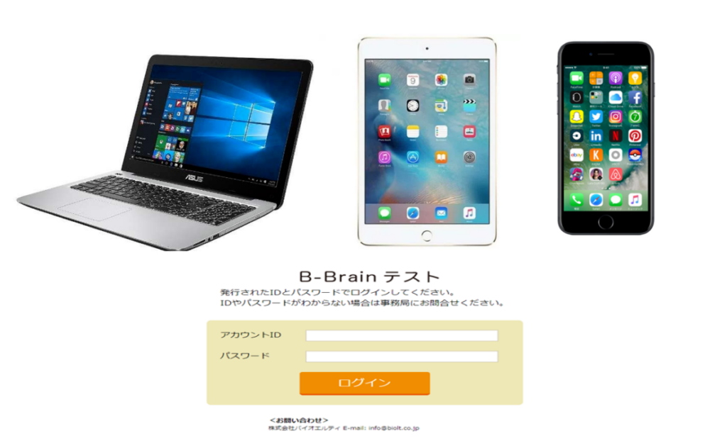 脳トレ(B-BRAIN) ビーブレイン(B-BRAIN)の活用シーン B-BRAIN はお客様のビジネスや、個人の環境改善などに活用できます。 B-Brainの利用方法 ネットが繋がるパソコン、タブレット、スマホを使用しご案内するURLにアクセスし、5,6分で80問の設問に答えるだけです。 ご興味がある方はこちらのフォームにて、ご連絡ください。 利用を申し込む B-Brainの結果 設問に回答後、すぐにテスト結果のレポートが受け取れます。その結果を元に、カウンセリングの日程を調整させていただきます。